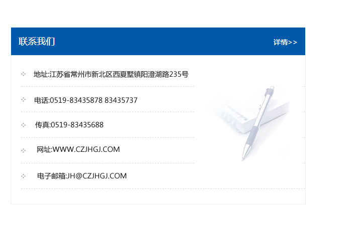 地址:常州市新北區(qū)友邦商務大廈1幢16、17層  電話:0519-85101652  傳真:0519-85112595  郵編:213022  網址:www_cz-jiayue_cn.szypyl.com  郵箱:xiajifengaa@163.com